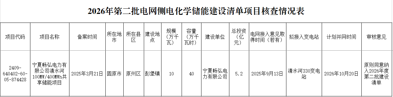 关于对固原市纳入自治区2026年度第二批电网侧电化学储能项目建设清单的公示