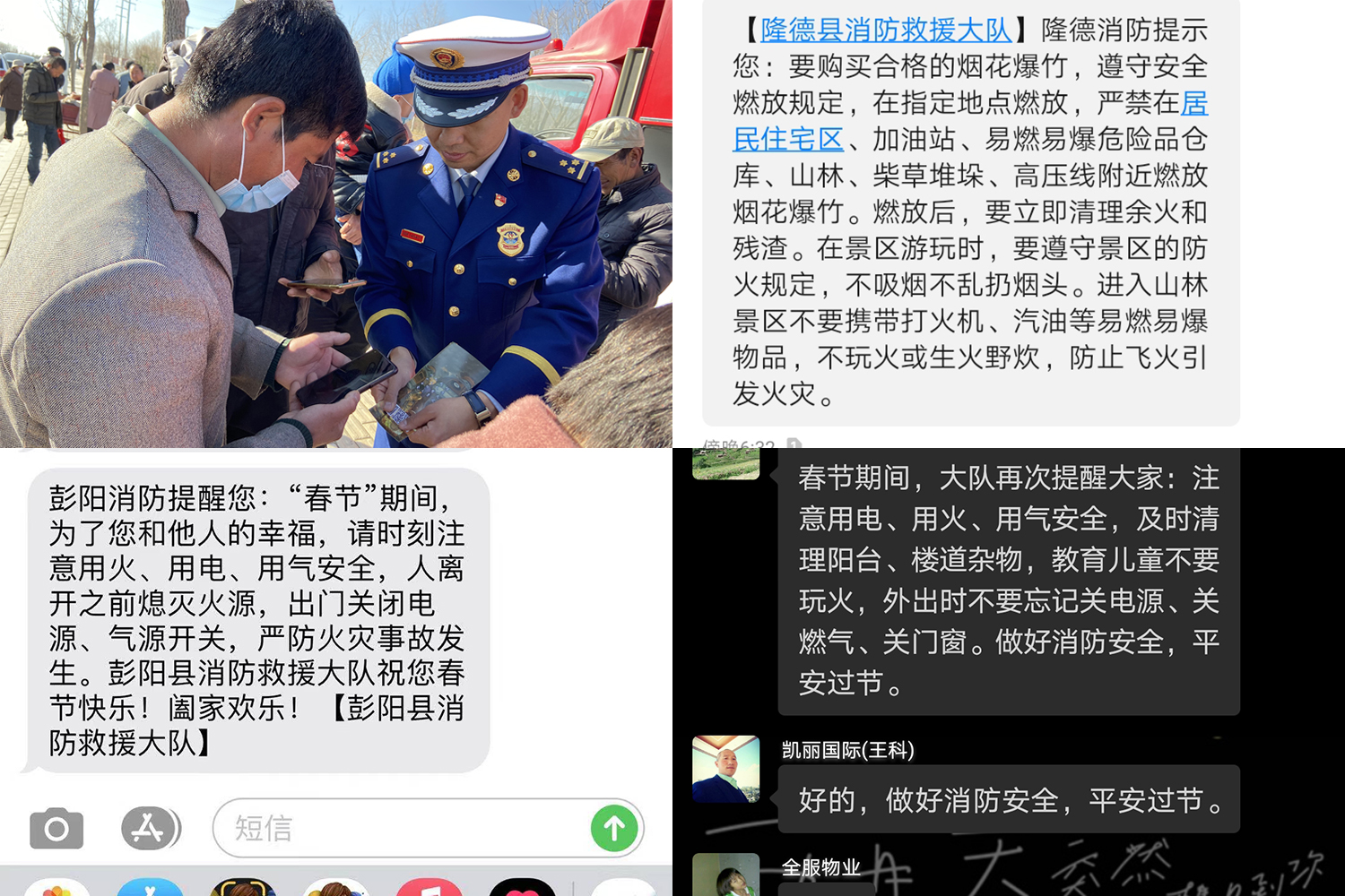 “线上学”宣传推动安全大警示。支队各级积极推动社会单位组织员工关注“宁夏消防”“固原消防”微信公众号,注册“全民云学习平台”,每天了解消防资讯,学习消防知识,了解火灾案例,通过“线上学”的培训形式比传统上门组织集中培训的方式,传播范围更广,传播速度更快,受众面更大。同时,协调电信运营商发送提示短信,利用微信群发布安全提示信息等,这种信息化的宣传方式更便捷的警示人们要注意防火安全,为辖区消防安全筑牢屏障。