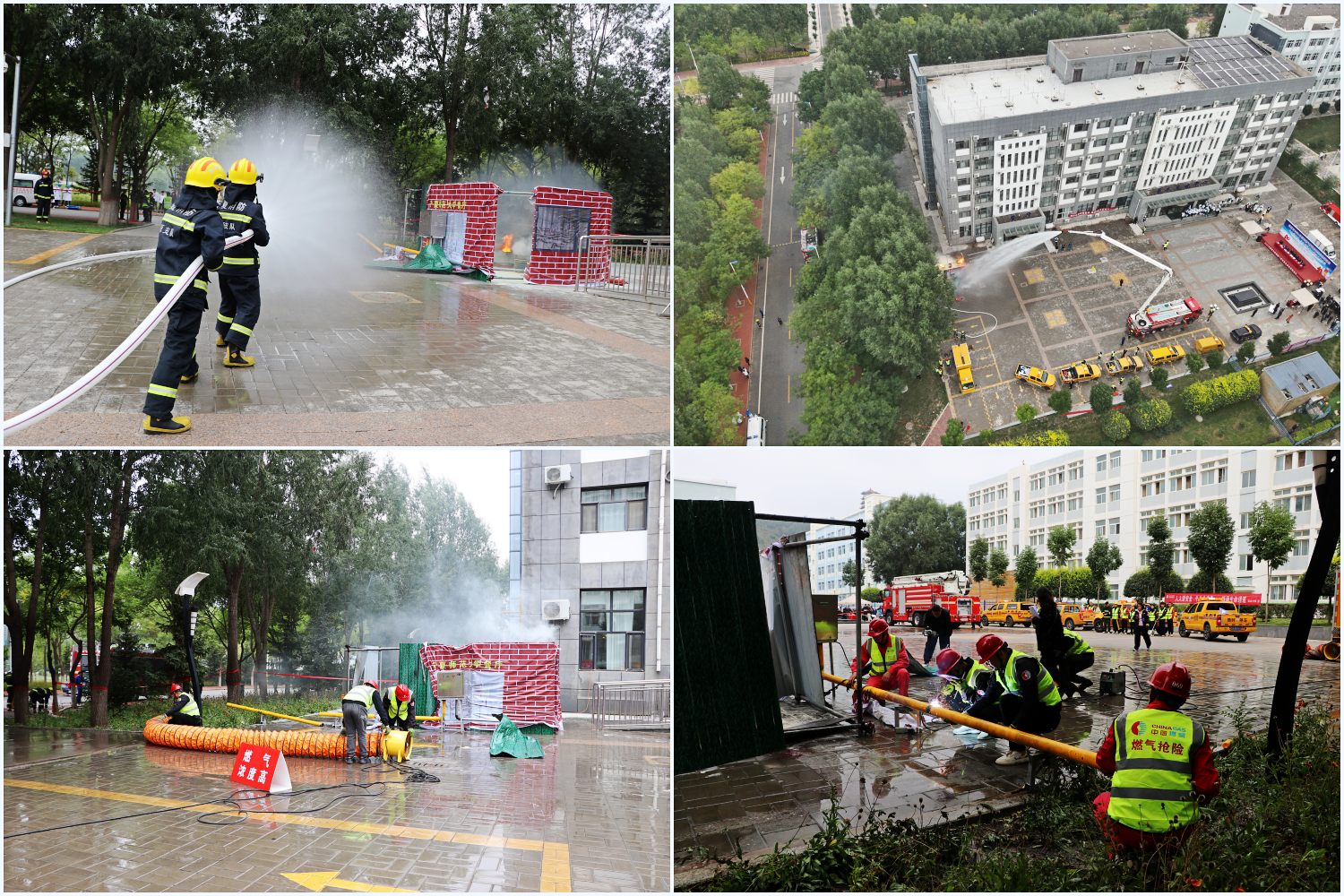 演练模拟9月12日14时30分,受大雨影响,位于师范大学雁苑餐厅附近路面塌陷致使中压管道被拉断,造成燃气大量泄漏,周边地下管沟聚集大量燃气,部分泄漏燃气通过下水管沟窜至临近餐厅遇明火发生爆炸燃烧,造成人员受伤。餐厅工作人员上报师范大学安全负责人,向单位微型消防站发出火情警报,启动内部应急预案,迅速组织人员扑救初期火灾。同时对现场及周边的人员进行疏散,并拨打110、120、119热线及固原中燃公司应急抢险电话报告燃气泄漏、部分泄漏燃气通过下水管沟窜至临近餐厅遇明火发生爆炸燃烧具体情况,各应急救援力量到场进行紧急救援。演练过程中,现场侦查组、应急救援组、医疗救护组、安全警戒组、通讯联络组5个小组迅速反应、各司其职。消防救援人员到达现场后,经现场侦查,发现燃气泄漏浓度较大,随时再次发生爆炸,需要快速冷却降温,指挥员立即下达作战命令灭火冷却组根据侦查搜救组提供的火点位置铺设水带干线进行稀释、灭火,同时利用26米举高喷射消防车对餐厅外墙进行降温稀释,整个救援过程高效有序、环环紧扣,各救援小组协同配合、处置科学,积极展示了事故中逃生、救援的方法,进一步提高了指战员应对突发事件的处置能力。