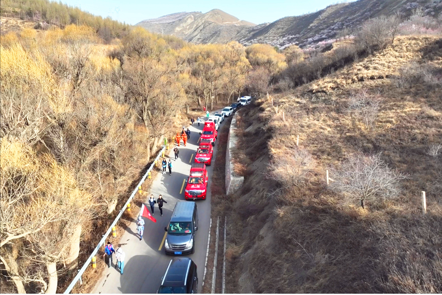 二是全程守护,硬核护航。天未破晓、朝阳未升,消防执勤力量已全部抵达指定点位,整装待发。随着徒步队伍出发号令响起,支队执勤车辆与指战员同步跟进,沿路线分段布防、流动巡逻,蜿蜒山路上,身着“火焰蓝”的身影随处可见。在黄峁山陡峭路段、急弯险坡、山林入口等关键点位,消防员定点值守,提醒师生注意脚下安全、严禁携带火种、规范行进秩序;在队伍首尾及中间段落,巡逻小组不间断穿梭,实时掌握队伍动态,快速处置突发状况。面对全程14小时、54公里的超长守护,全体消防指战员不畏艰辛、连续作战,用脚步丈量山路,用坚守守护平安,成为红色徒步路上最亮眼的“平安守护者”。