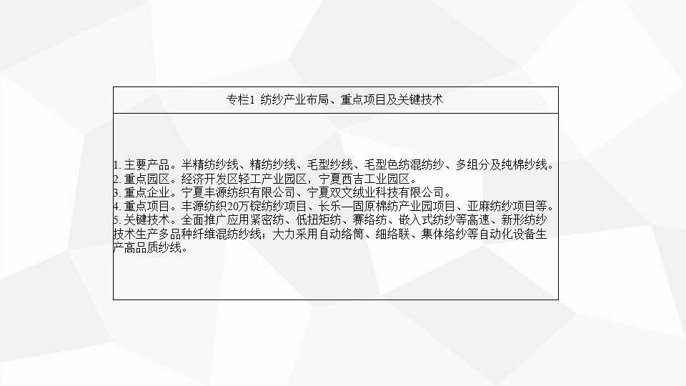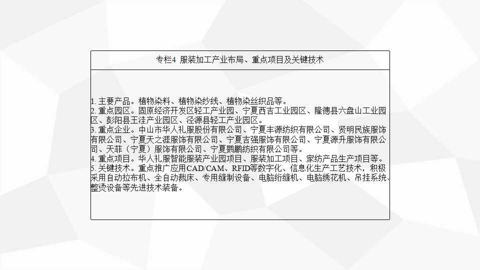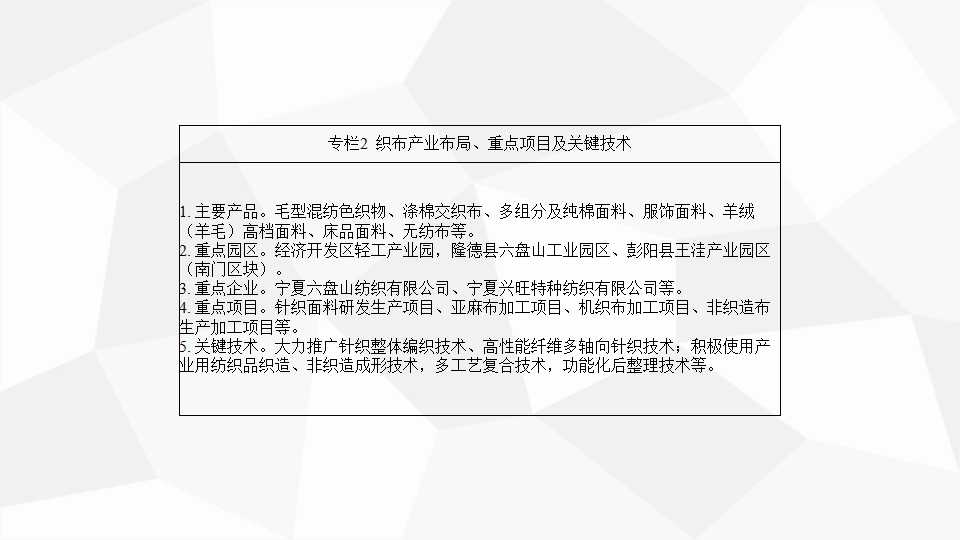 | 标 题: | 图解:固原市“十四五”现代纺织及服装加工产业发展规划 | ||