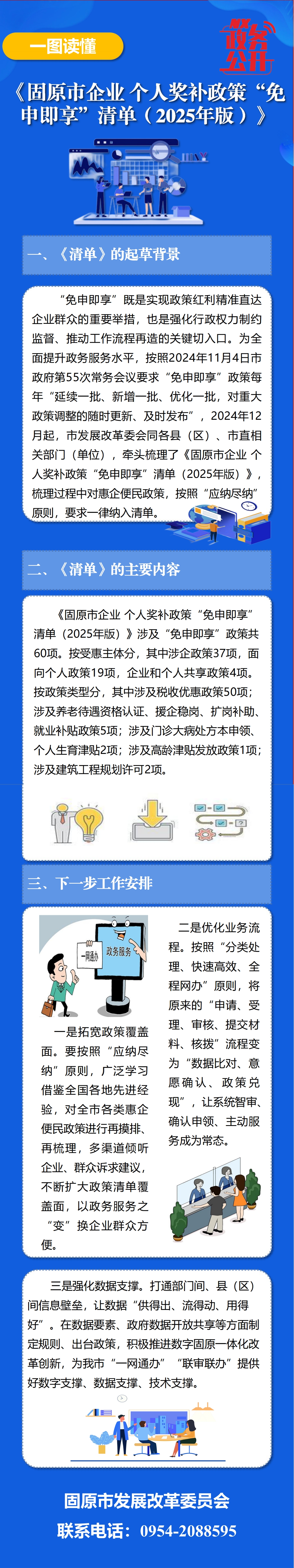 | 标 题: | 一图读懂:《固原市企业 个人奖补政策“免申即享”清单(2025年版)》 | ||