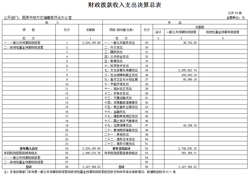 注:本表反映部门本年度的总收支和年末结余结转情况,数据取自财决01表