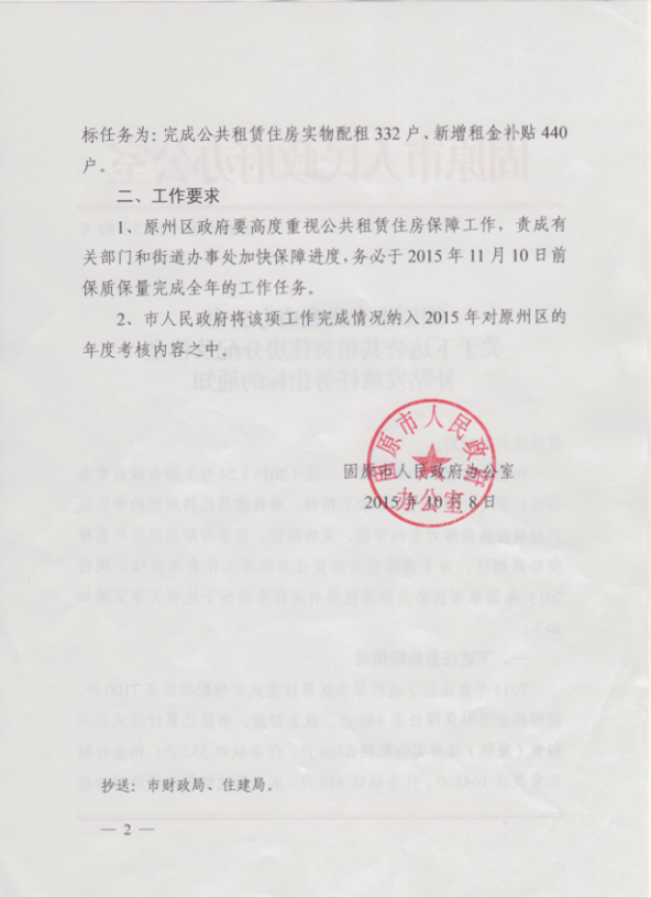 标 题: 固原市人民政府办公室关于下达公共租赁住房分配及租金补贴发放任务指标的通知
