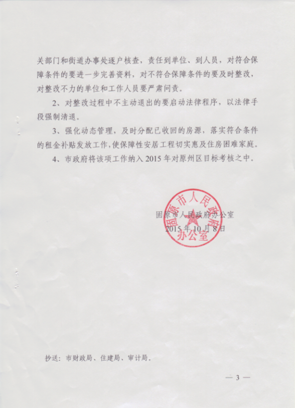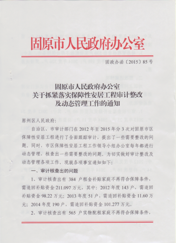 标 题: 固原市人民政府办公室关于抓紧落实保障性安居工程审计整改及动态管理工作的通知