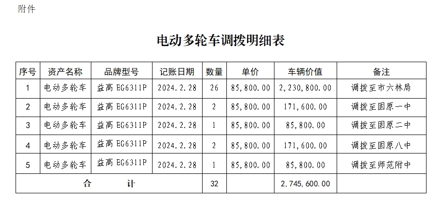 你单位《关于上缴处置电动多轮车辆的报告》(固公发〔2024〕14号)收悉。为提高国有资产使用效率,加强财政资源统筹,依据《固原市本级行政事业单位国有资产处置管理办法》相关规定,经研究,现将你单位上缴的32辆电动多轮车清除特定标识后调拨至固原市六盘山林业局、市属中学使用,现将有关事宜批复如下: