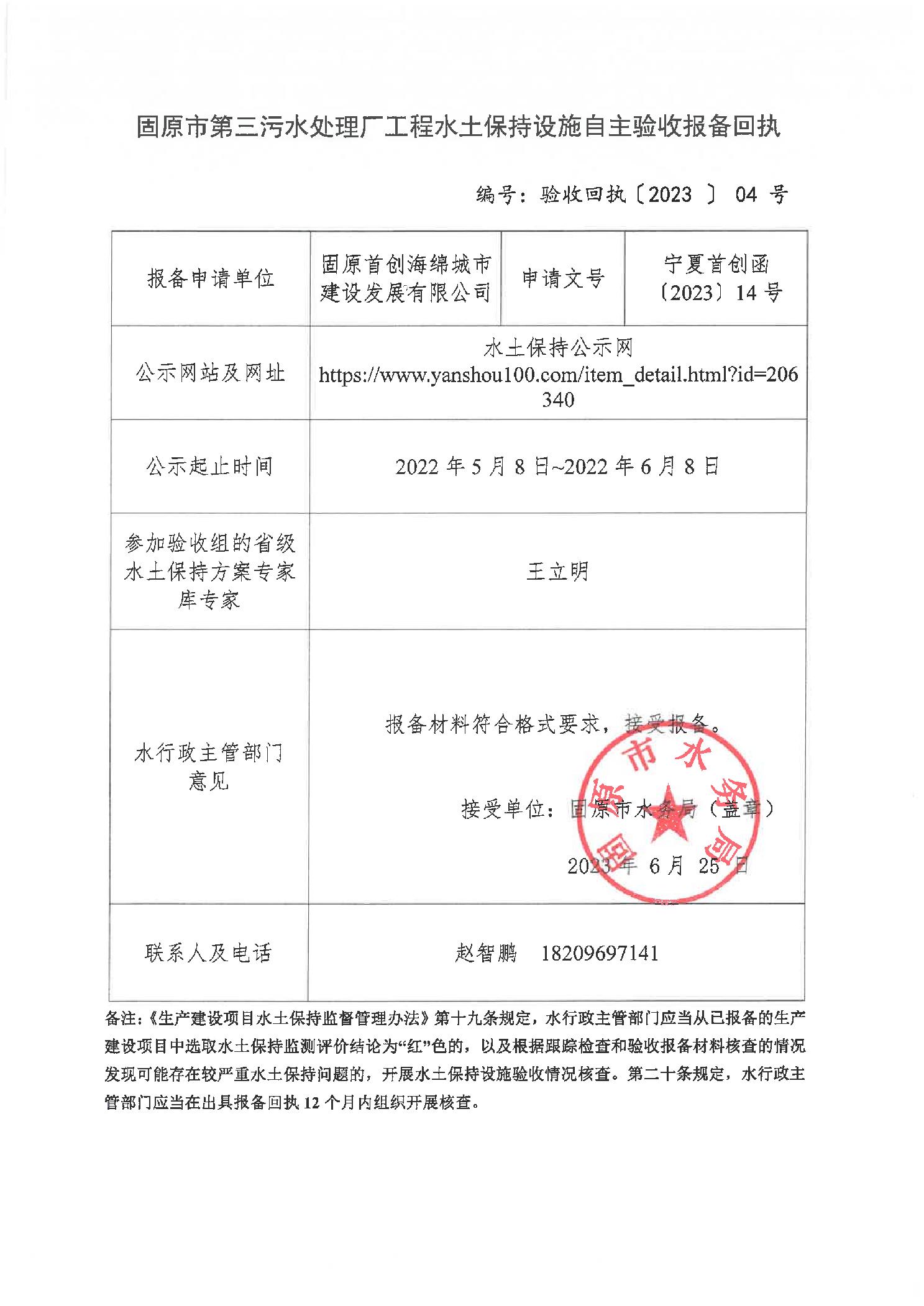 标 题: 固原市第三污水处理厂工程水土保持设施自主验收报备回执