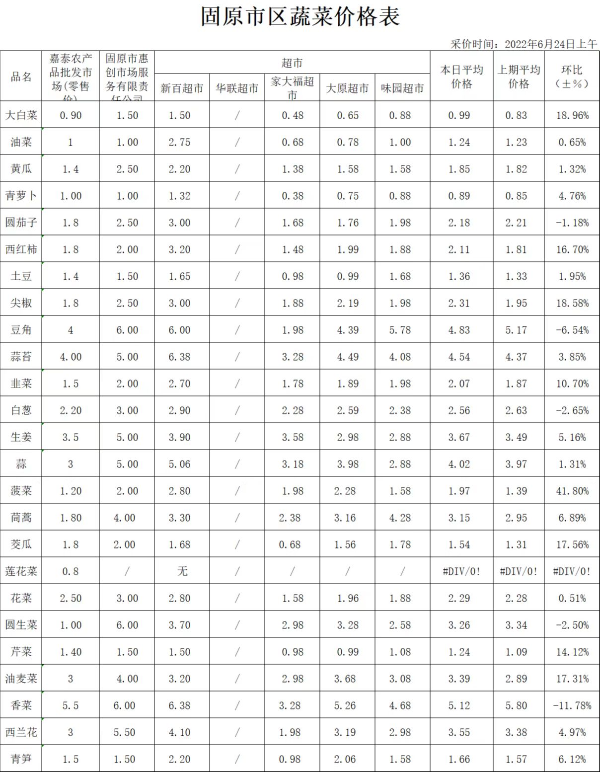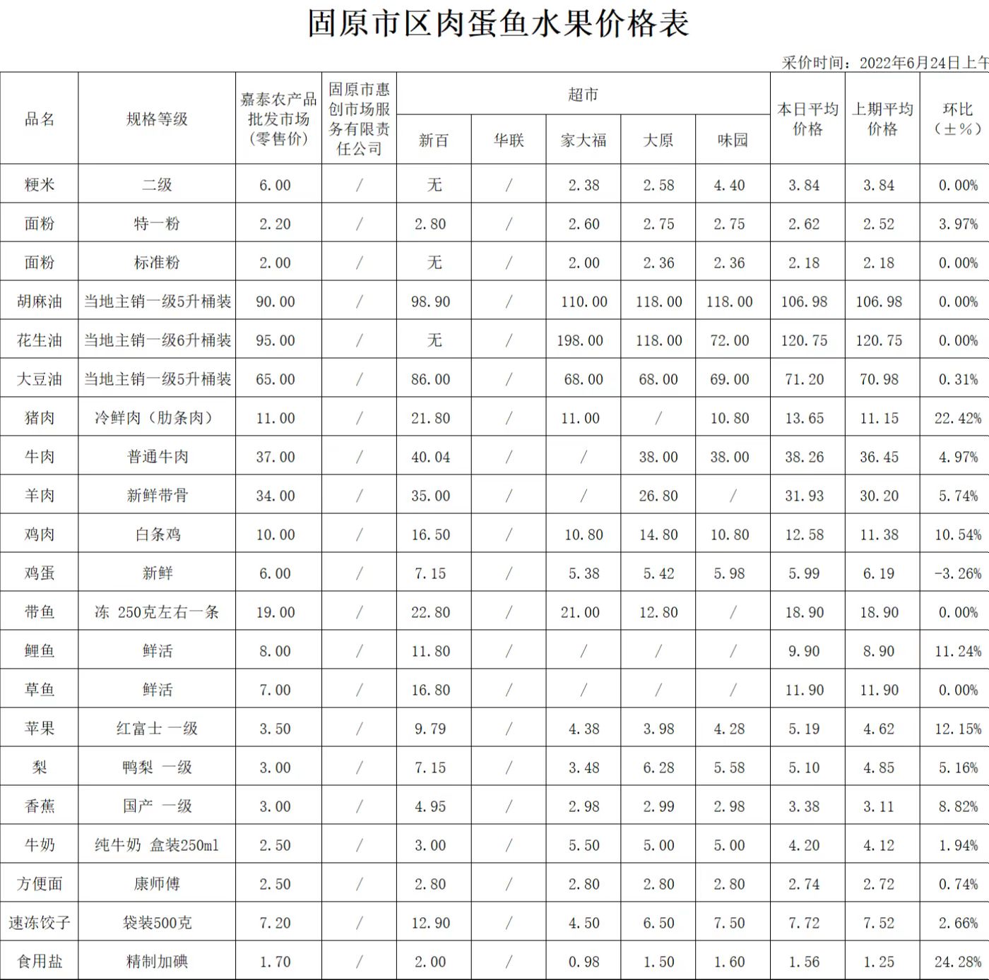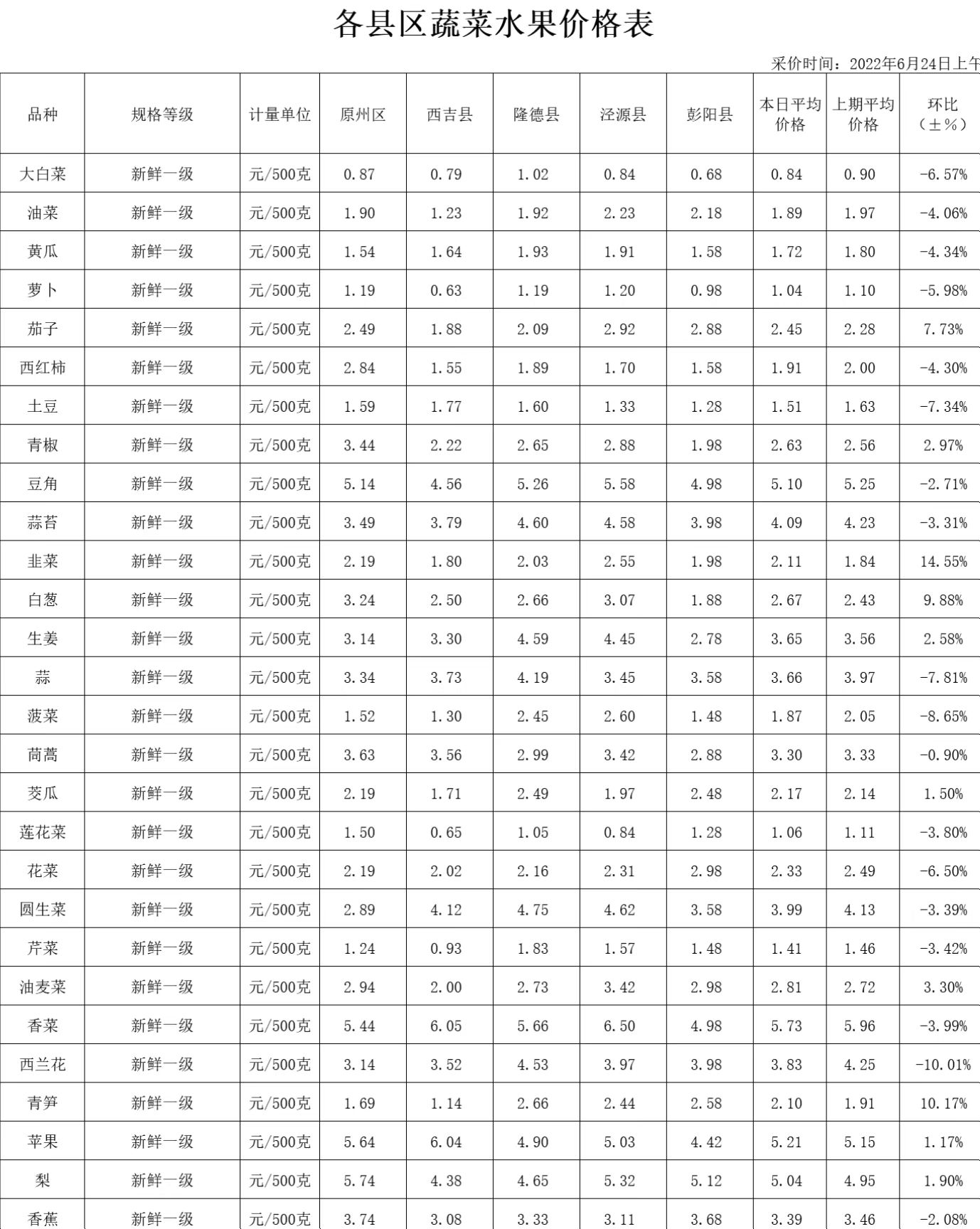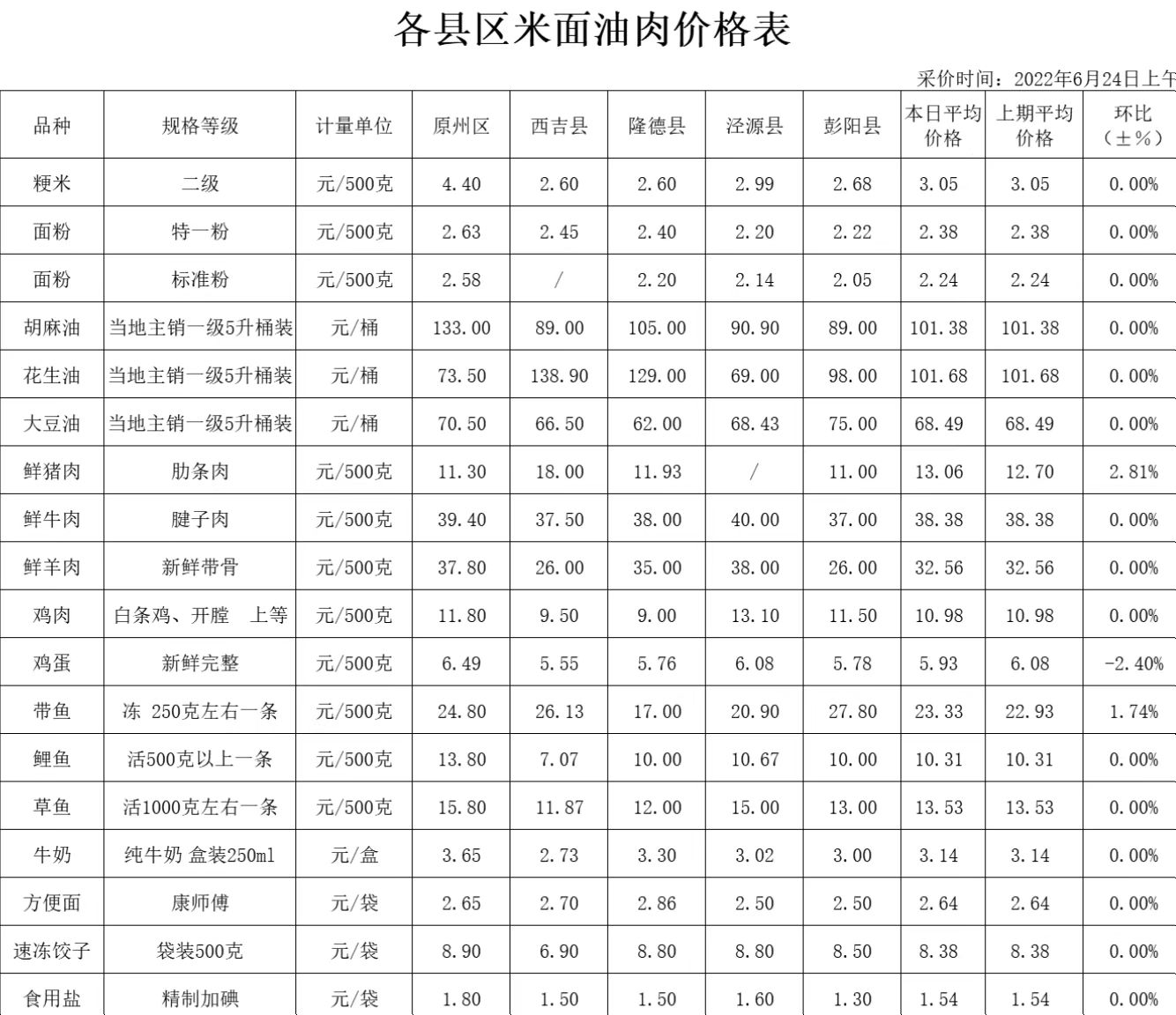 据价格监测数据显示:6月24日,全市居民生活必需品储备充足,米面、油价格基本稳定,肉价以涨为主,鸡蛋价格回落,蔬菜、水果价格有涨有跌,现将主要监测商品价格予以发布。