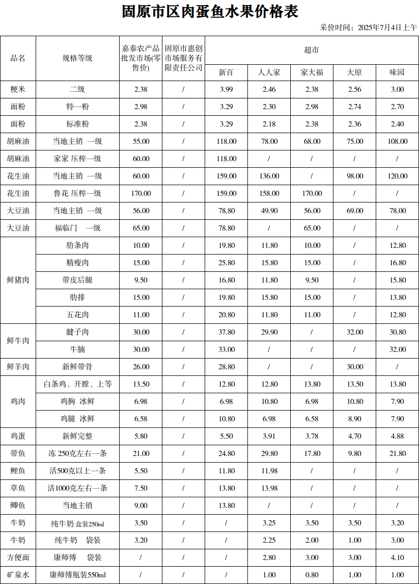 标 题: 固原重要民生价格信息(2025年7月4日)