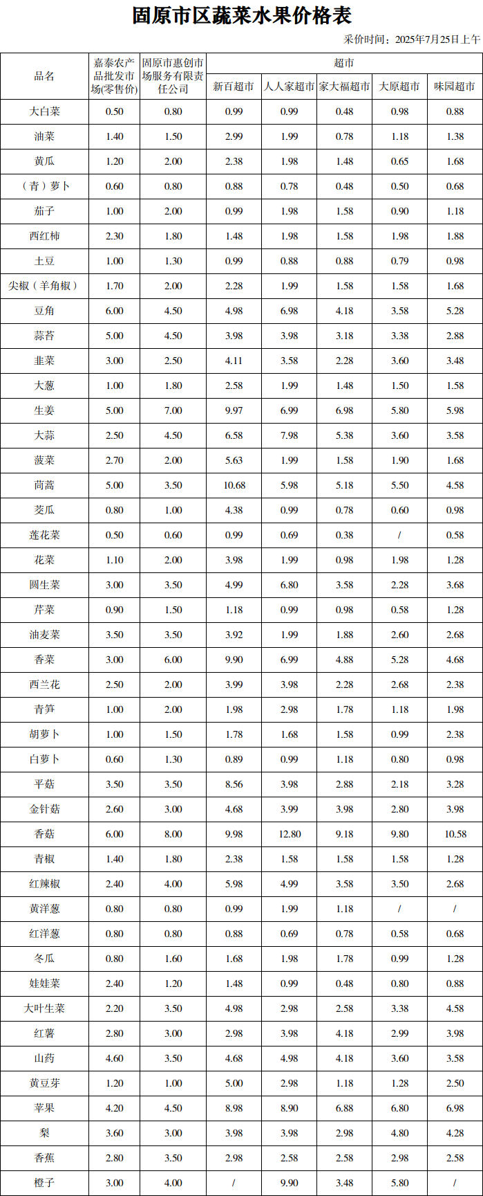 标 题: 固原重要民生价格信息(2025年7月25日)