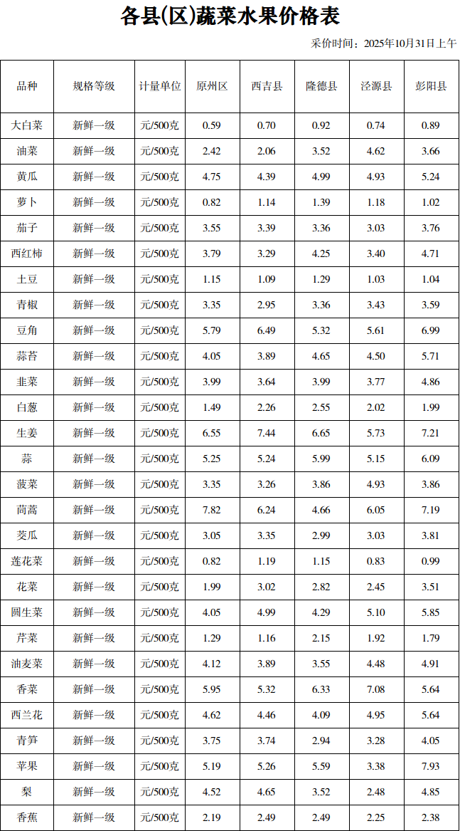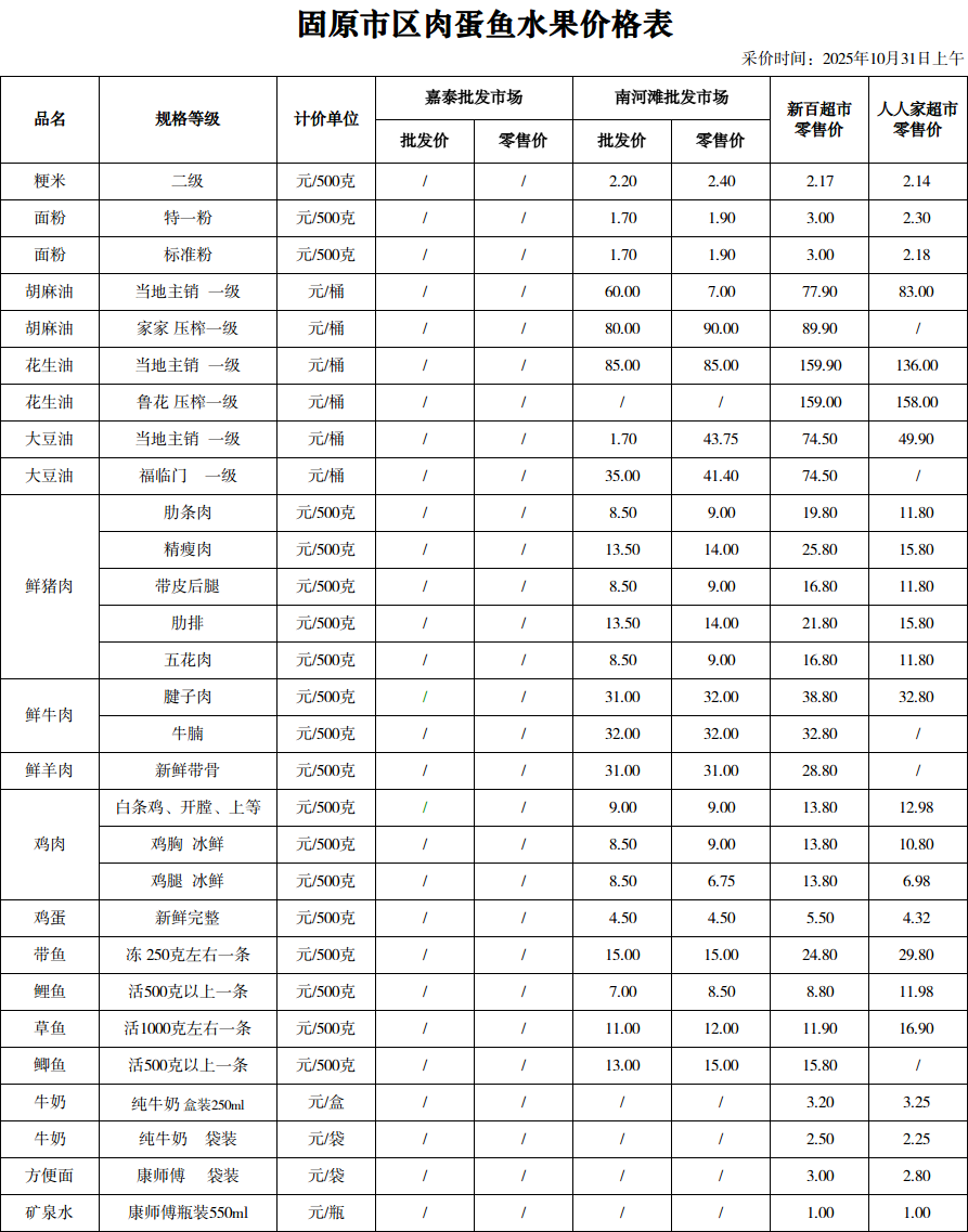 标 题: 固原重要民生价格信息(2025年10月31日)