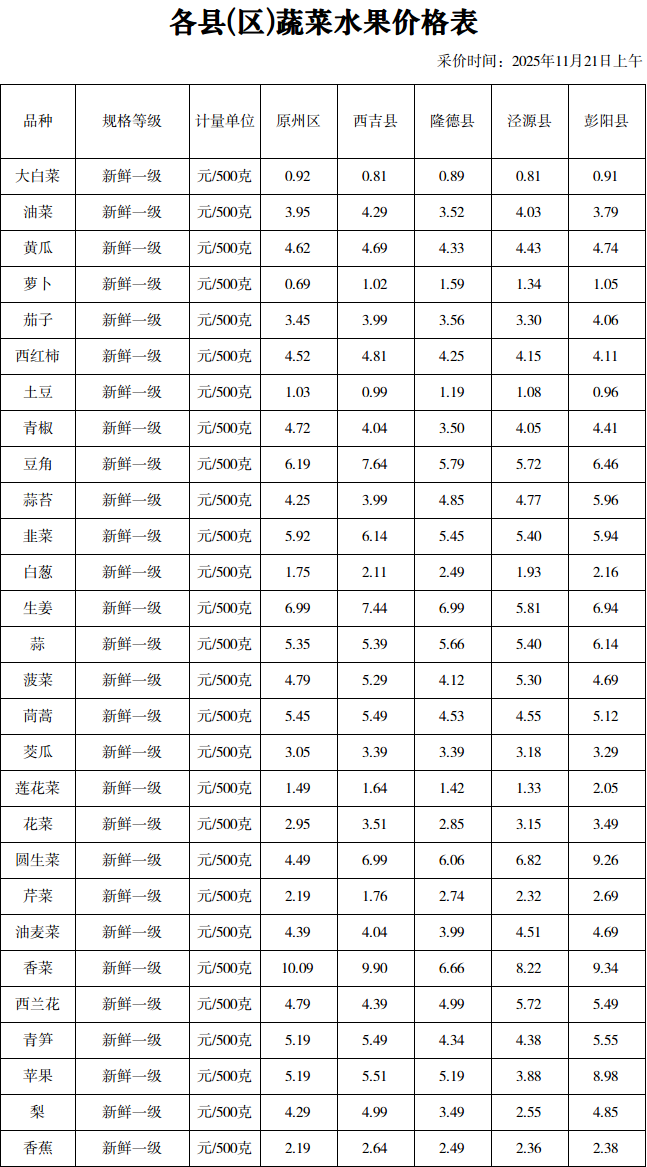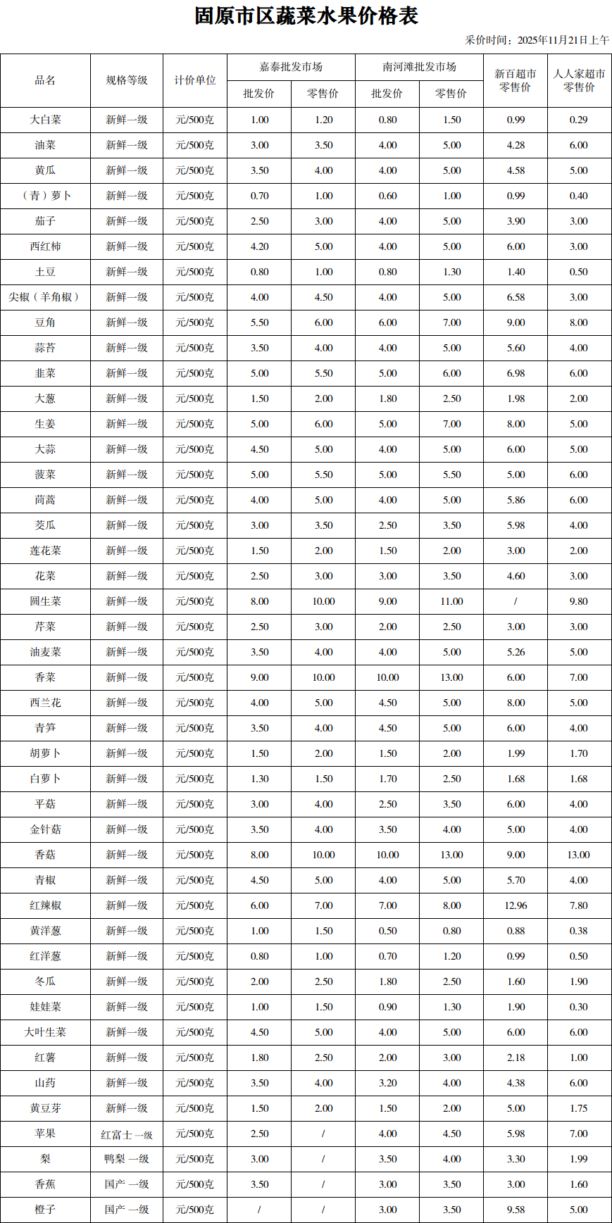 标 题: 固原重要民生价格信息(2025年11月21日)