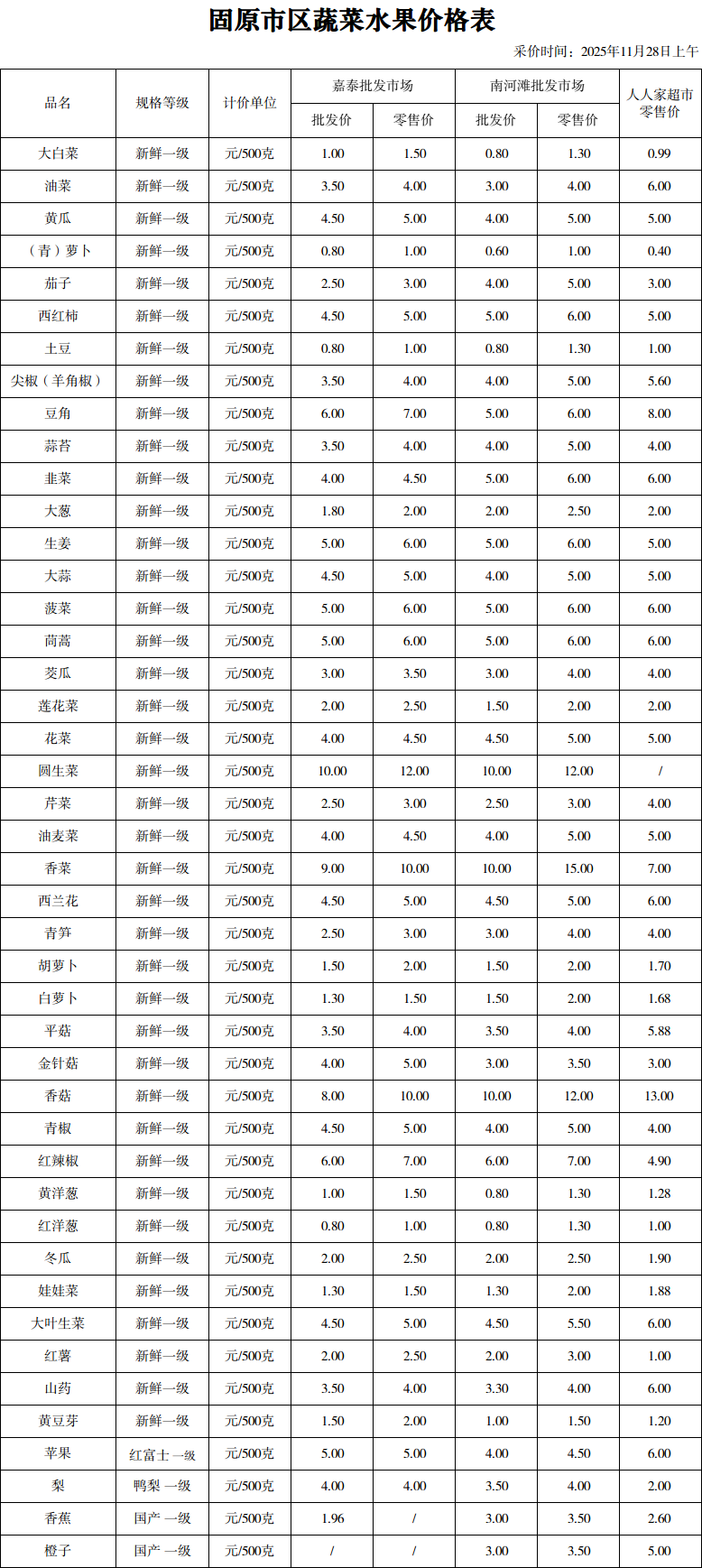 标 题: 固原重要民生价格信息(2025年11月28日)