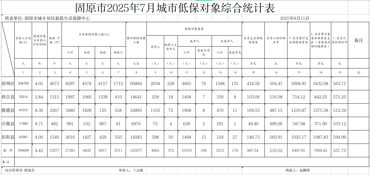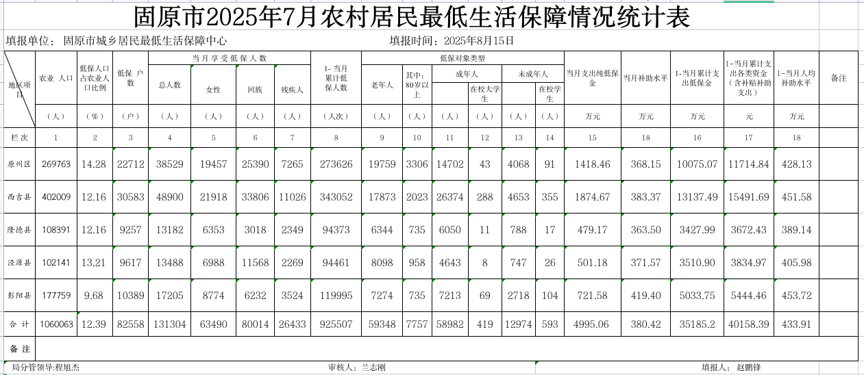 标 题: 固原市2025年7月低保对象综合统计表