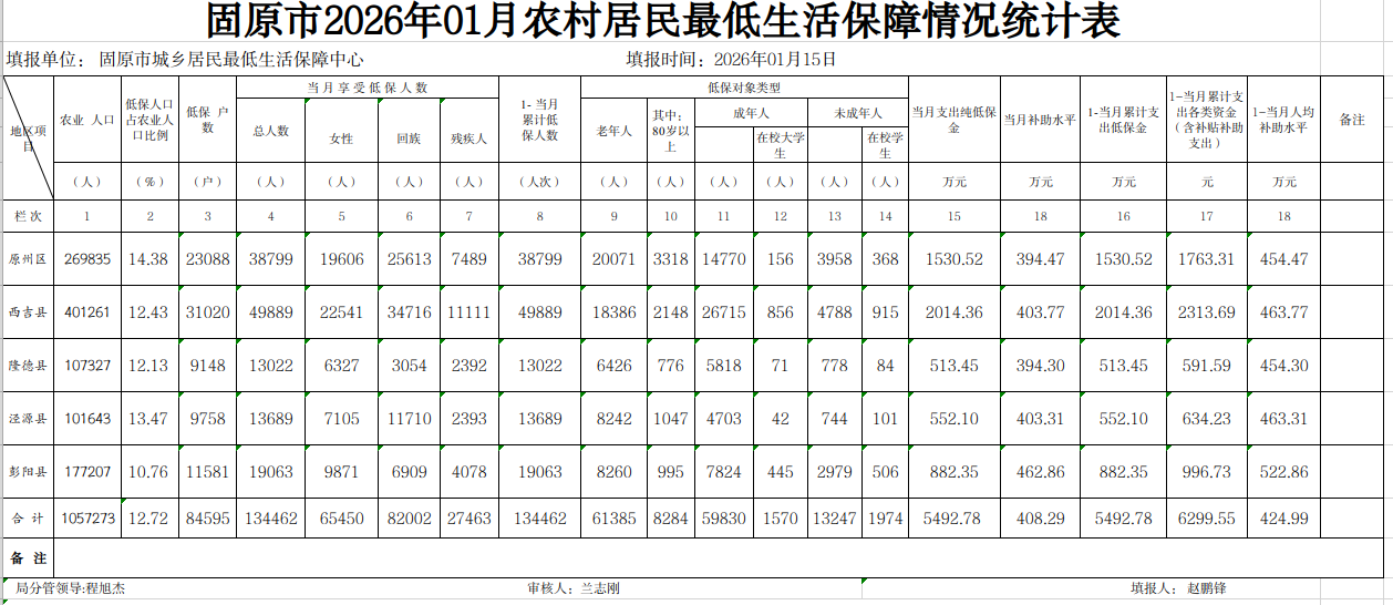 标 题: 固原市2026年1月份城乡居民最低生活保障情况综合统计表