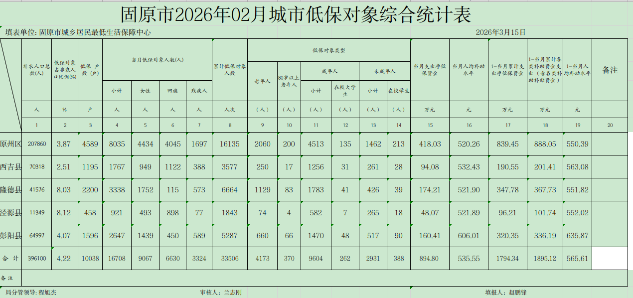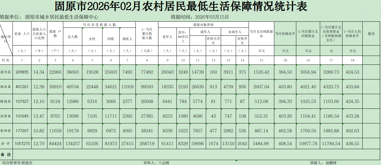 标 题: 固原市2026年2月份城乡居民最低生活保障情况综合统计表