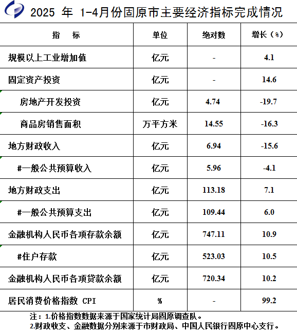 标 题: 2025年1-4月份固原市主要经济指标完成情况