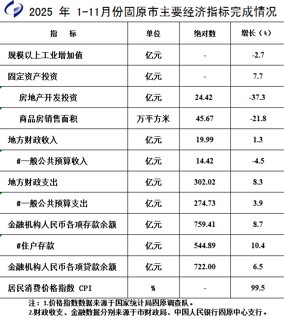 2025年1-11月份固原市主要经济指标完成情况