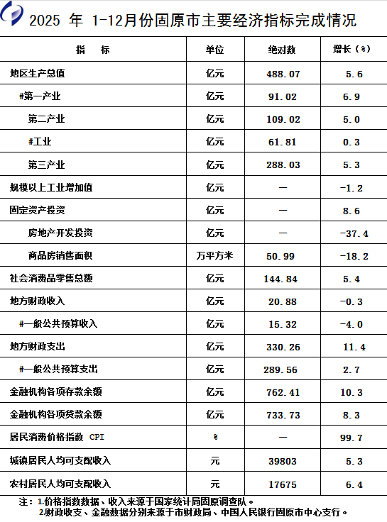 2025年1-12月份固原市主要经济指标完成情况