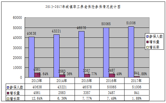 2017年,企业职工基本养老保险基本养老金支出41256.21万元,比上年增加3519.43万元,增长8.5%;比2013年增加17946.55万元,年平均增长12%。