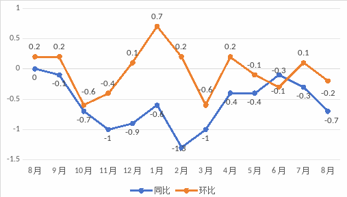 (三)非食品价格下降。8月份,非食品价格下降0.2%,较上月扩大0.7个百分点。