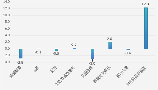 (一)八大类商品及服务价格同比呈“三涨五降”态势。其中,其他用品及服务价格上涨12.3%,教育文化娱乐价格上涨2.0%,生活用品及服务价格上涨0.3%;食品烟酒价格下降2.8%,衣着价格下降0.1%,居住价格下降0.5%,交通通信价格下降3.0%,医疗保健价格下降0.4%(见图2)。