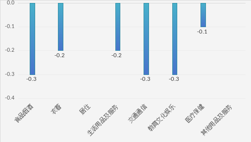 (一)八大类商品及服务价格环比呈“六降二平”态势。其中,食品烟酒、衣着、生活用品及服务、交通通信、教育文化娱乐、医疗保健价格分别下降0.3%、0.2%、0.2%、0.3%、0.3%、0.1%;居住、其他用品及服务价格持平。(见图3)。